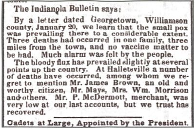 McDermott’s pattern of operation was similar to Ballard. He operated a gin, purchased the county’s produce, dealt in cattle and hogs, as well as cotton, and in turned shipped or carted them to Lavaca. McDermott did an extensive business boasting in 1852 of having “the largest stock in the upper county” but had about twelve to fifteen thousand out on credit extended to settlers in the area.