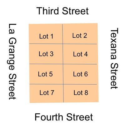 Block 11 is located south of the Courthouse square and is bordered by Third St. on the north, Fourth St. on the south, Texana St. on the east and La Grange St. on the west. The block is comprised of eight lots each lot being 80 varas X 80 varas. What is a Vara? Click Here to find out.