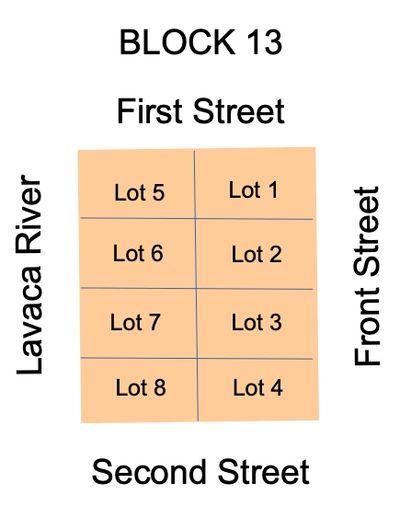 Block 13 is located West of the Courthouse square and is bordered by First St. on the north, Second St. on the south, Front St. on the east and the Lavaca River on the west. The block is comprised of eight lots each lot being 80 varas X 80 varas. What is a Vara? Click Here to find out.