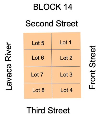 Block 14 is located west of the Courthouse square and is bordered by Second St. on the north, Third St. on the south, Front St. on the east and Lavaca River on the west. The block is comprised of eight lots each lot being 80 varas by 80 varas. What is a Vara? Click here to find out.