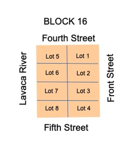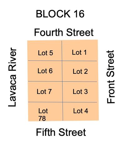 Block 16 is located west of the Courthouse square and is bordered by Fourth St. on the north, Fifth St. on the south, Front St. on the east and the Lavaca River on the west. The block is comprised of eight lots each lot 80 varas X 80 varas. What is a Vara? CLICK HERE to find out.